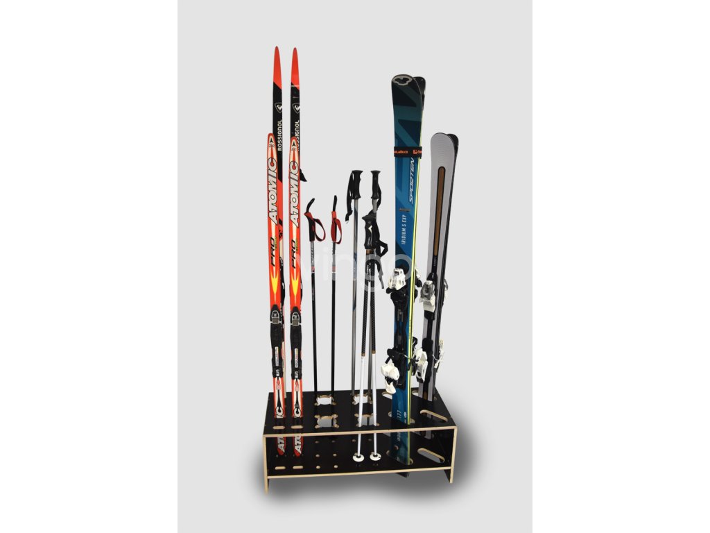 - Tágas: Az állvány 4 pár sílécre, 4 pár sífutóra és 8 pár botra van tervezve. A sílécek számára kialakított nyílás méretei 11 x 4,5 cm. Nagyobb nyílás is készíthető. Minden rés egy sífutó számára van. A sífutók leggyakrabban használt sarokrészének mérete 40 - 48 mm, így probléma nélkül elhelyezhetők egy 55 x 16 mm-es nyílásba. A botok számára kialakított nyílások úgy készültek, hogy a botok egyenesen álljanak.